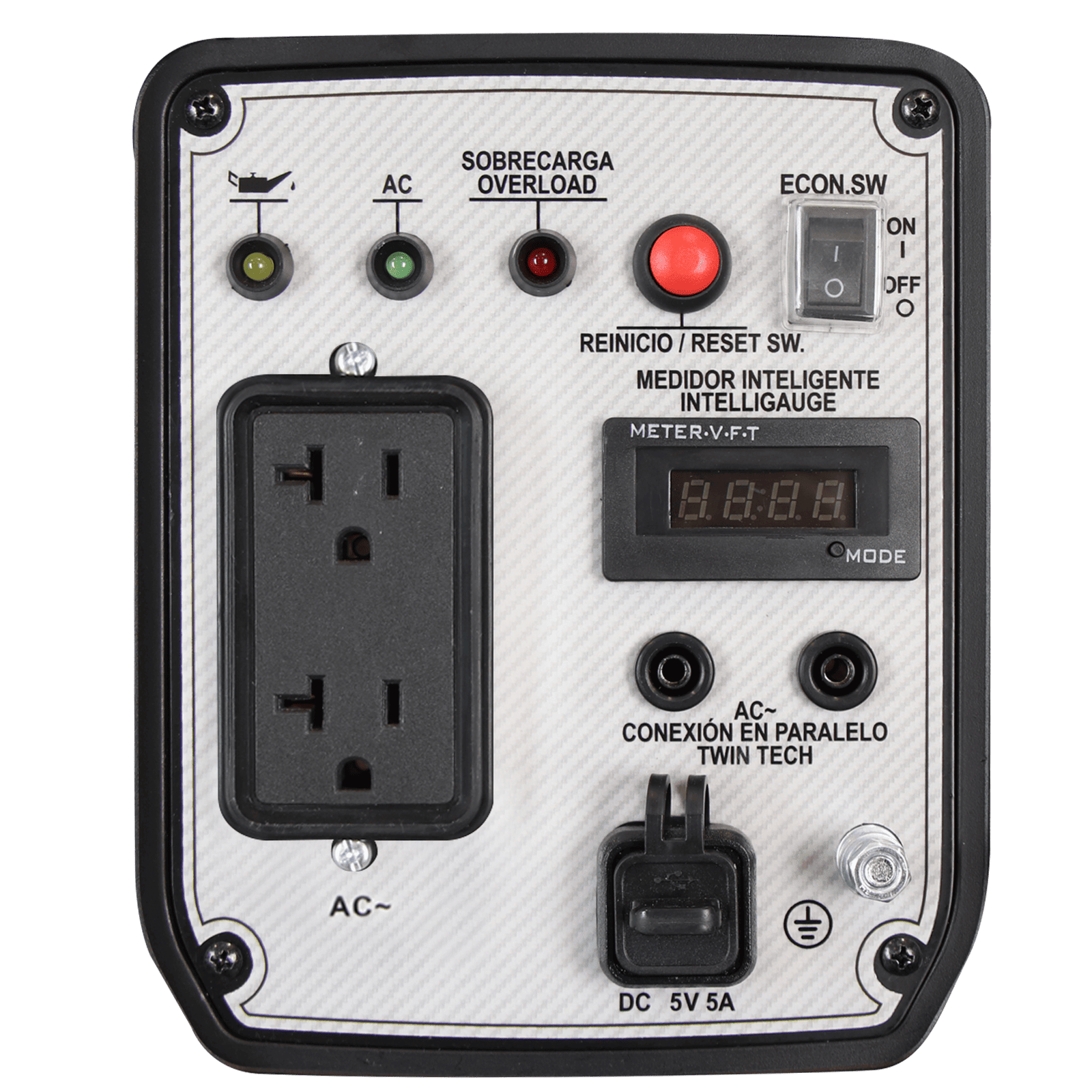 | Panel de control (Conexiones) | 1 Contacto dúplex 120 VCA (15 A) 1 USB tipo A (2.5 A) 1 USB tipo C (3 A) |